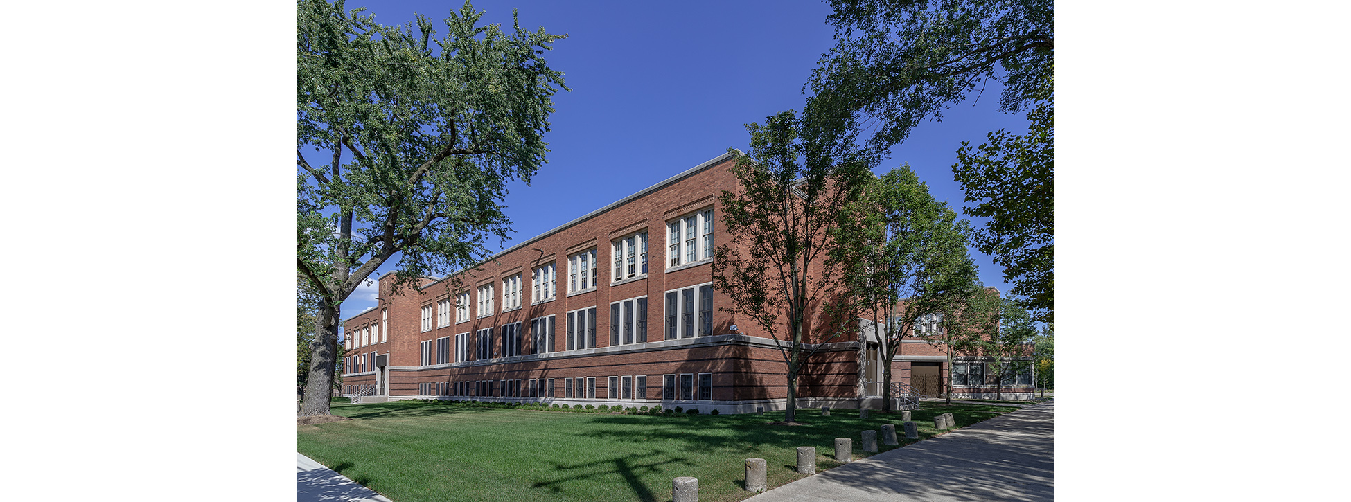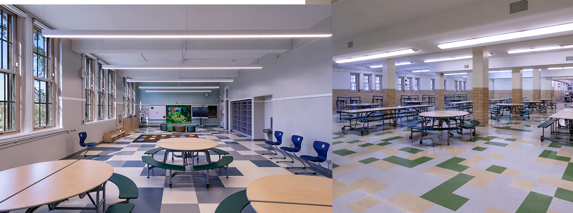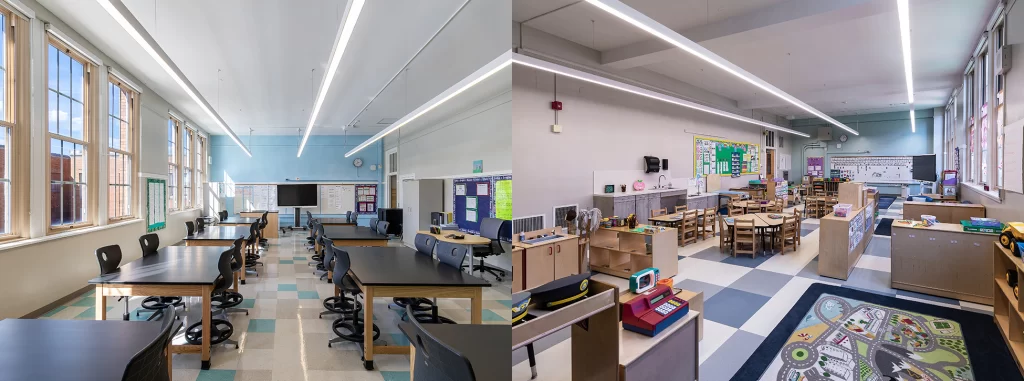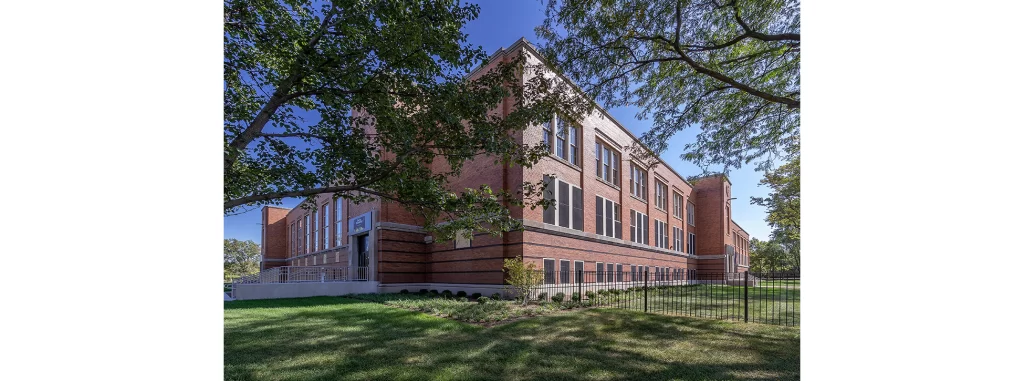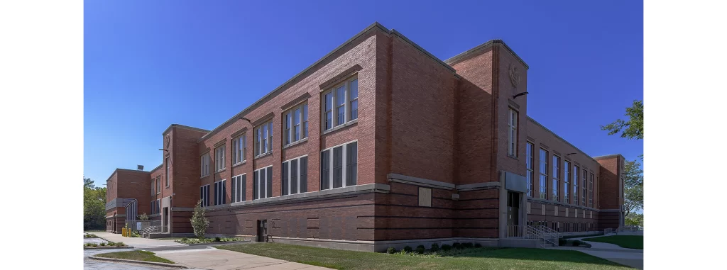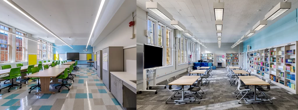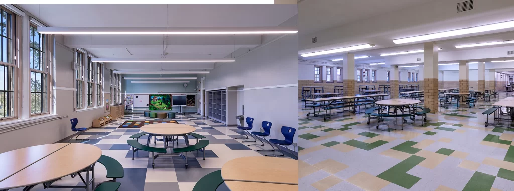 Inside, 44 classrooms—including dedicated spaces for science, art and music—surround a new library and cafeteria. The renovation also included playground relocation, ADA compliance, full mechanical and electrical upgrades and comprehensive building envelope restoration.