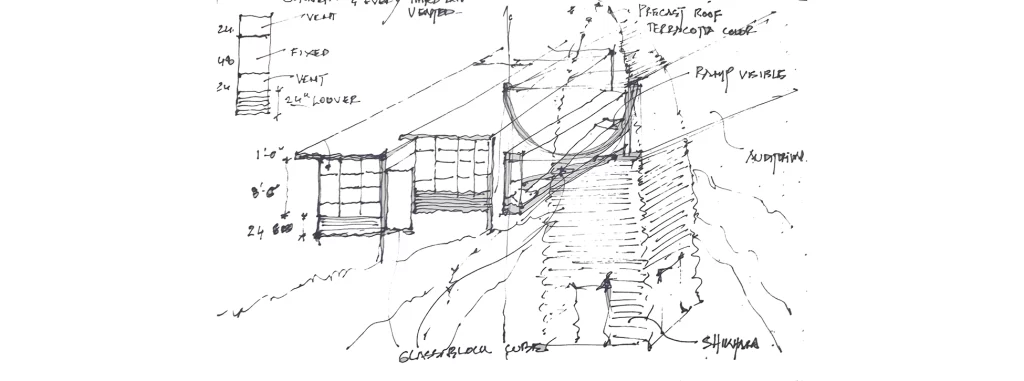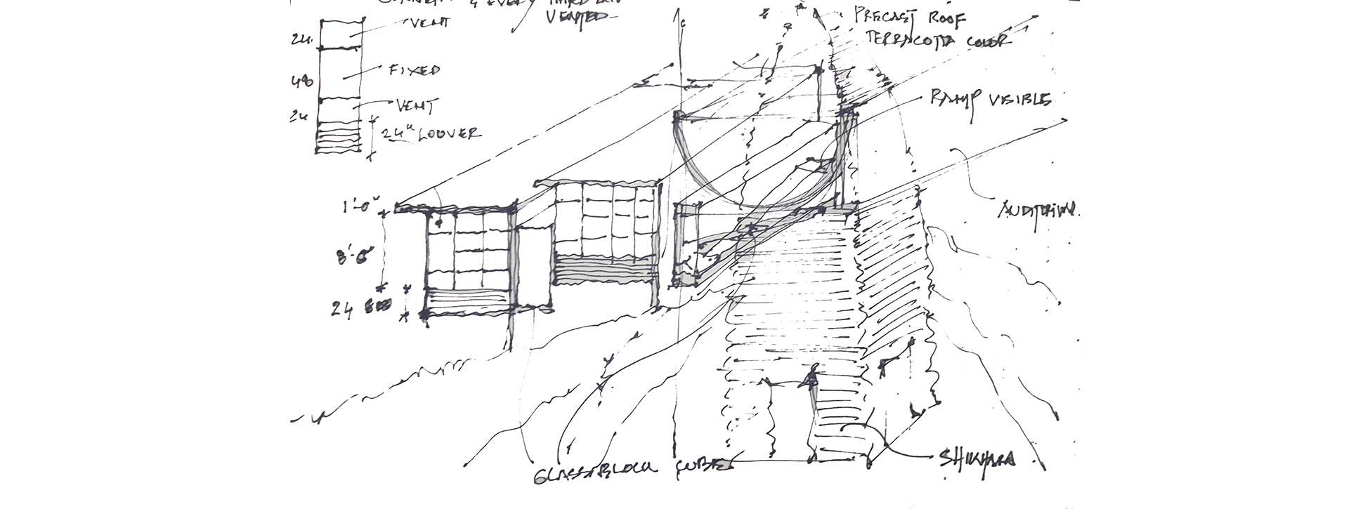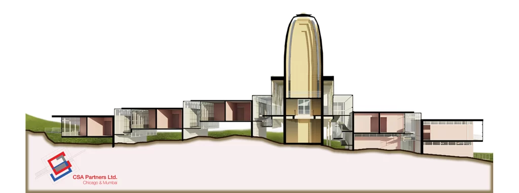 The proposed new school building will provide for the following: a. 7 large pods, each 52.5ft x 28ft accommodating two classrooms, bathrooms, meeting rooms, and offices. b. Each of these pods could be further divided by partitions into 14 smaller (34 ft x 14ft in size) spaces. c. A multi-purpose hall which can accommodate flexible uses for recitals, dance, lectures, and other media presentations, and includes a green room facility. d. The facility is completely accessible for people with disabilities by elevators, and as each level is connected by a system of ramps, which also serve as display galleries for rotating exhibits. e. The entire ensemble of structures have been designed to work with our hilly site topography and touch the land gently. Designed by an architect from CSA-Partners, Ltd., the following conceptual plan has been proposed.