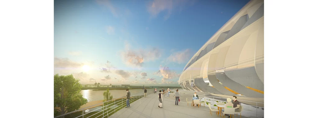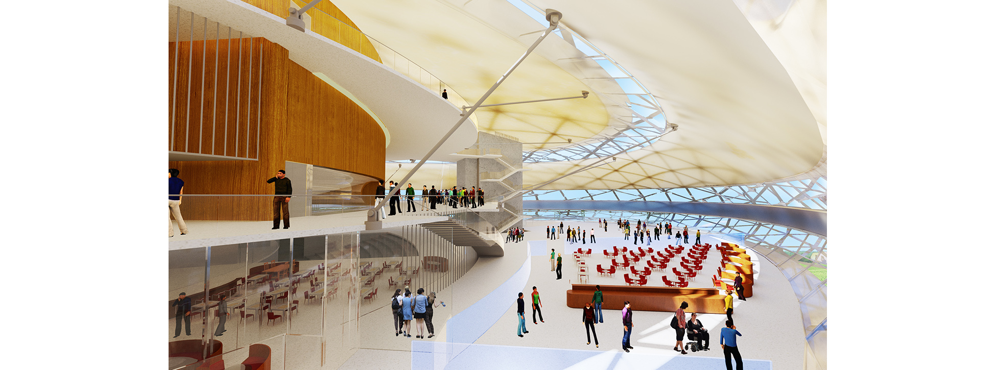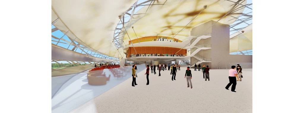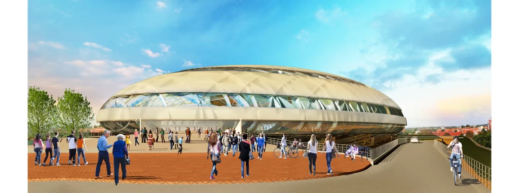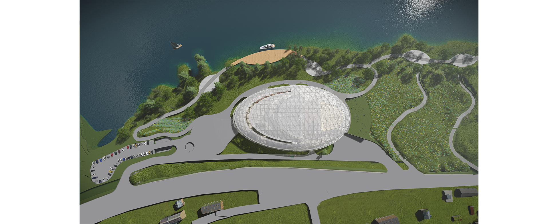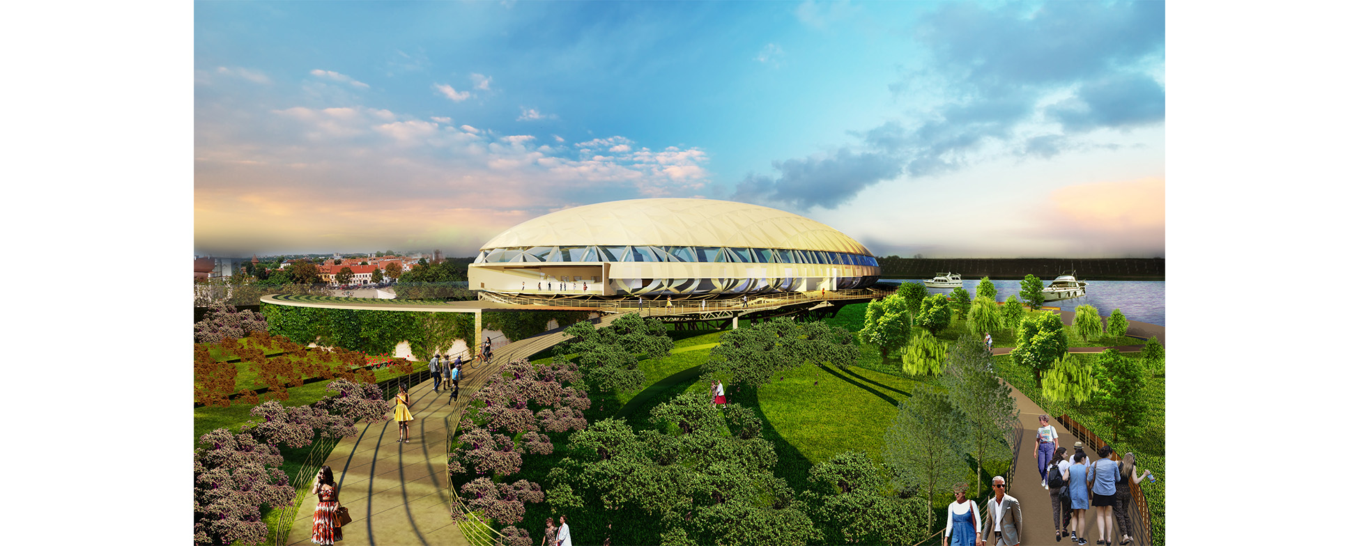 The project inferences included Mikalojus Konstantinas Čiurlionis a polymath/genius who was an exponent in the arts, music, and math among other things. Our concept approach decided on the metaphor of a river bank pebble shaped lattice frame shell resting on four simple cradles thereby providing the river to takes its course and modify sedimentation and erosion patterns. Our objects within the pebble included 2 auditoriums both suspended from this lattice structure shell to keep things as delicate and light with views north to the main city and views through the shell to the river panorama on all side.