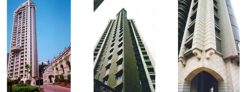 Being attached to a heritage building in a prime locality of Mumbai, the plans for the new apartment building underwent scrutiny by a number of regulatory and historic preservation bodies, ensuring that each architectural gesture maintained the integrity of the sanatorium. In the first phase, the existing kitchen and toilet facilities, which were originally detached from the main residential wing of the sanatorium, were demolished. In lieu of this, each unit was provided with a kitchen and toilet facility. Such a provision created much needed floor space that was added to the new tower. As it stands, the twenty-six-story ‘T’ shaped tower consists of forty-eight luxury condominiums on the bottom twenty-four floors, planned symmetrically around a central stem of services. The top two levels house a state-of-the-art health club and a terrace pool. In terms of its facade, the building is founded and cantilevered on tall arches with deep brackets, created to harmonize with the existing ground floor facade of the sanatorium. Large fluted balconies on three sides help define deep shadows and channel wind flows through the units. To achieve a rusticated look like the existing façade, face-cut plaster and exposed brick are alternately used. An open penthouse, that attempts to refer to the scroll and panel motifs of the existing building, tops the entire structure.