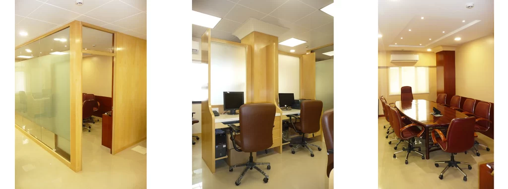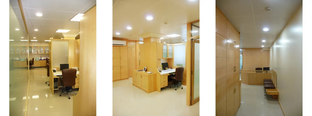 Lighter maple for work areas.Demure mahogany for office cabins and conference areas.